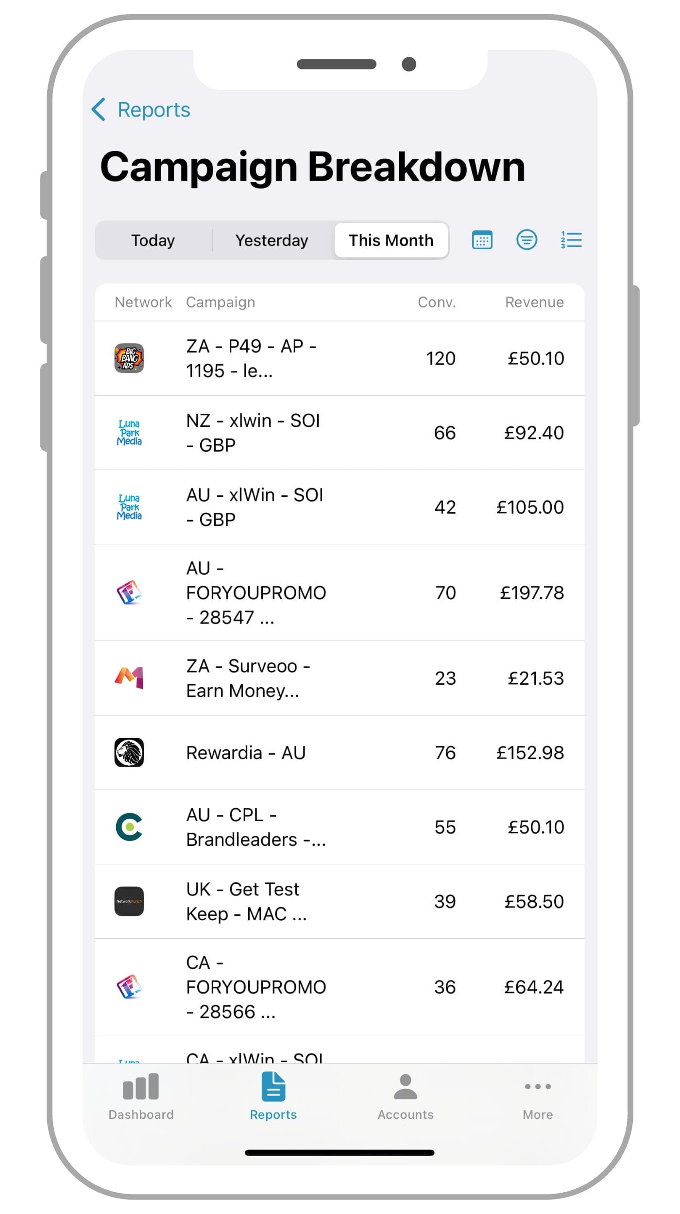 Easily pull up breakdowns in the app to see your earnings by Account, Campaign and Conversion. Want to uncover more detail? Simply turn your phone to see more data.